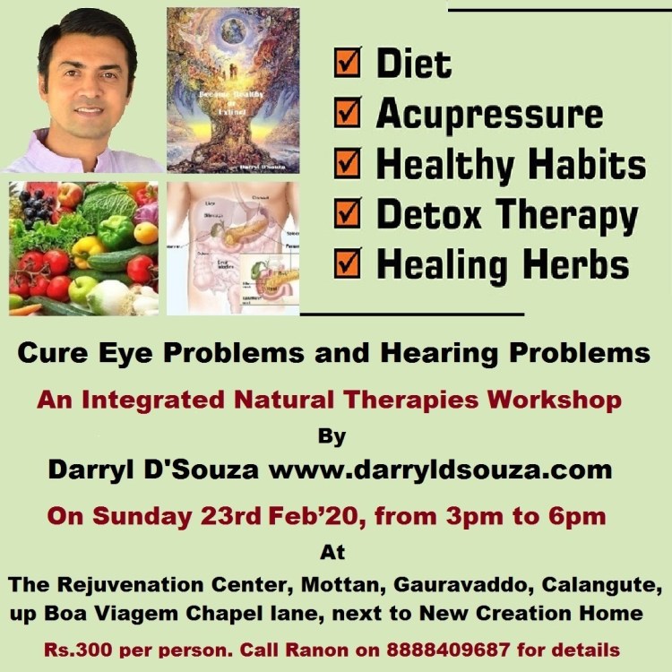 3 pm – 6 pm – Cure Eye Problems and Hearing Problems with Integrated Natural Therapies. A learn how to heal yourself workshop by Darryl D’Souza, Pioneer in Integrative Medicine www.darryldsouza.com Fee Rs.300 per person. Call Ranon on 8888409687 to book your seat for this workshop.
